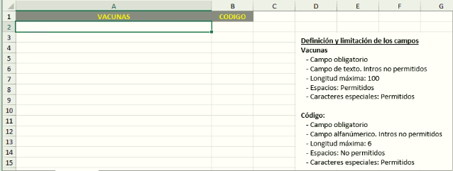 En esta imagen podemos ver que desde el menú desplegable de herramientas podemos obtener la siguiente plantilla de excel para la importación de las vacunas al mantenimiento.