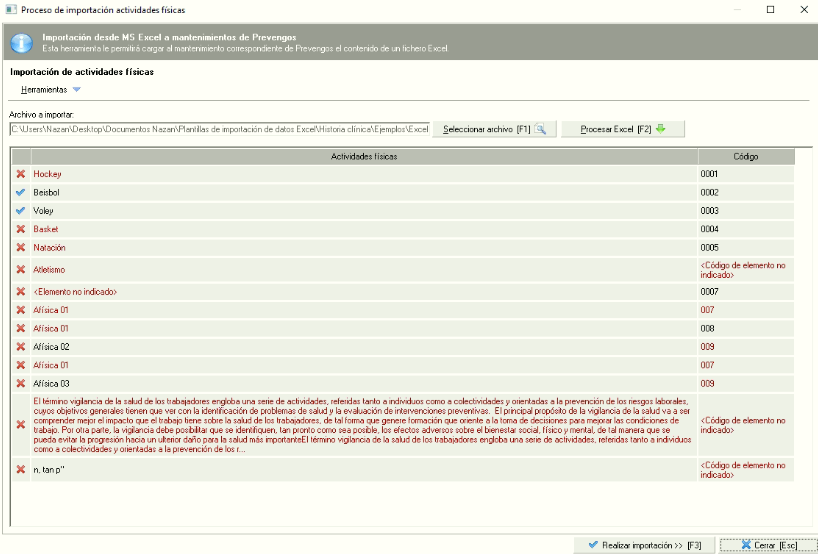 Una vez tengamos el excel con la información que queramos cargar, seleccionaremos su ubicación en el importador de Actividades Físicas. Seguidamente pulsaremos "Procesar Excel" para que se cargue a Prevengos la información que contiene. Prevengos mostrará la importación con un formato similar a la ventana siguiente.