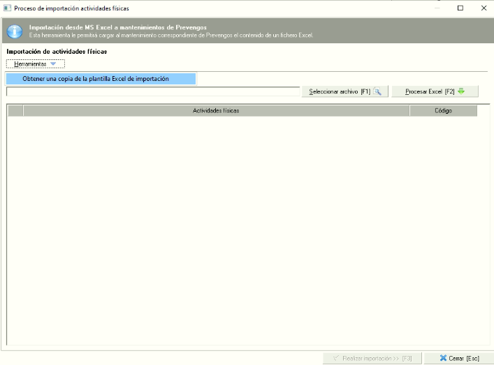 Prevengos dispone aquí de una herramienta que nos permite incorporar al mantenimiento de forma masiva los datos de las actividades físicas. Para ello, desde el menú "Edición -> Importar desde Excel" se nos abrirá el importador que tiene Prevengos tal y como vemos en la siguiente imagen.