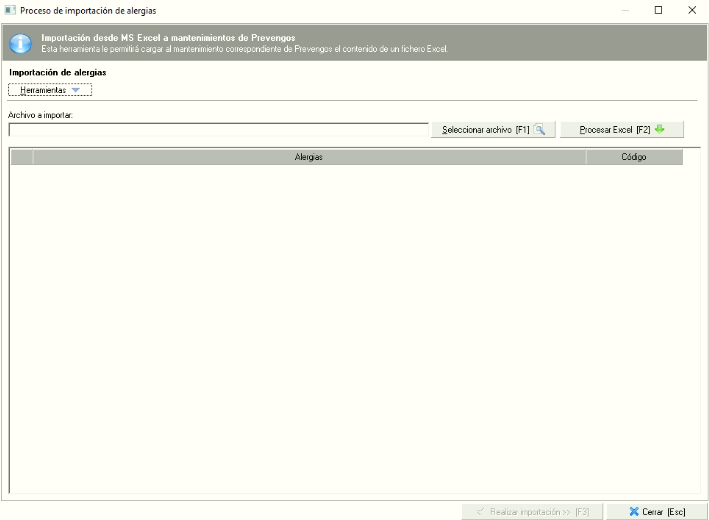 Prevengos dispone aquí de una herramienta que nos permite incorporar al mantenimiento de forma masiva los datos de las alergias. Para ello, desde el menú "Edición -> Importar desde Excel" se nos abrirá el importador que tiene Prevengos tal y como vemos en la siguiente imagen.