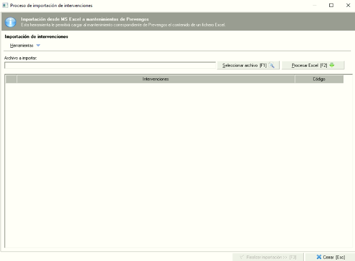 Prevengos dispone aquí de una herramienta que nos permite incorporar al mantenimiento de forma masiva los datos de las intervenciones quirúrgicas. Para ello, desde el menú "Edición -> Importar desde Excel" se nos abrirá el importador que tiene Prevengos tal y como vemos en la siguiente imagen.