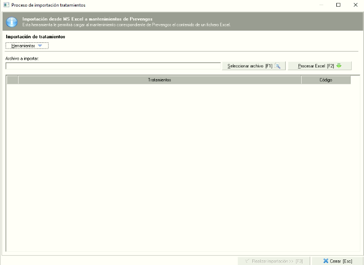 Prevengos dispone aquí de una herramienta que nos permite incorporar al mantenimiento de forma masiva los datos de los tratamientos médicos. Para ello, desde el menú "Edición -> Importar desde Excel" se nos abrirá el importador que tiene Prevengos tal y como vemos en la siguiente imagen.