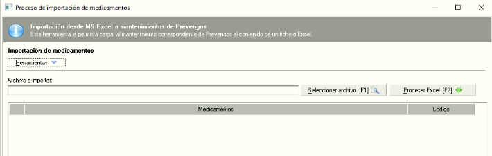 Prevengos dispone aquí de una herramienta que nos permite incorporar al mantenimiento de forma masiva los datos de los medicamentos. Para ello, desde el menú "Edición -> Importar desde Excel" se nos abrirá el importador que tiene Prevengos tal y como vemos en la siguiente imagen.