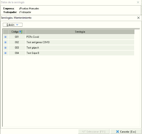 En este mantenimiento daremos de altas todas las serologías que queremos tener disponible para añadir dentro de una historia clínica o en el apartado de serologías de la empresa o consulta médica. Este mantenimiento sólo podremos encontrarlo en el desplegable correspondiente de la ficha de la serología que estemos registrando. Pinchando en el icono de lupa nos aparecerá un listado como el que podéis ver más abajo.