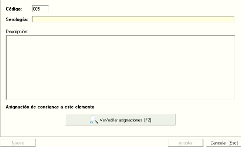 Debemos establecerle un código que puede ser alfanumérico pero indispensable que sea único, es decir, que no esté establecido en otra serología, no se puede repetir. Describiremos la serología y podemos establecer una consignas con el fin de que sean aplicadas automáticamente. Para más información sobre las asignación, vaya al manual de mantenimiento de consignas