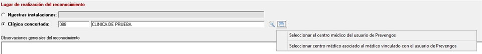 Uno de los usos de los centros médicos o clínicas concertadas vinculadas al médico, es que cuando el médico realice el reconocimiento médico al trabajador pueda seleccionar una de estas clínicas directamente con el botón que vemos en la siguiente imagen: