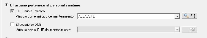 Es importante saber, que solo pueden validar un reconocimiento médico un usuario Administrador o un usuario Médico, por tanto es necesario asociar los médicos creados en este mantenimiento con los usuarios de prevengos. Como vimos en el manual de creación de usuario, establecemos esa vinculación en la pantalla de creación de usuarios, marcando la opción 'el usuario pertenece al personal sanitario' y eligiendo a que médico del mantenimiento corresponde, tal y como vemos en la siguiente imagen: