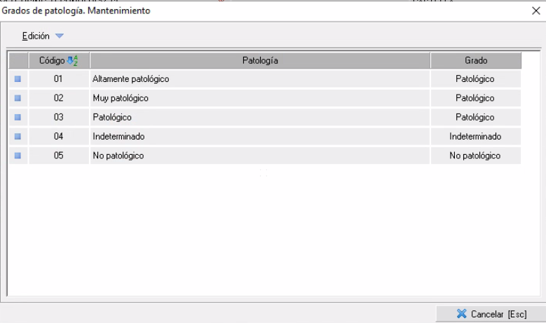El mantenimiento de patologías, es un mantenimiento simple y como en todos los mantenimientos dispone del menú Edición para crear/editar/eliminar los registros que desee.