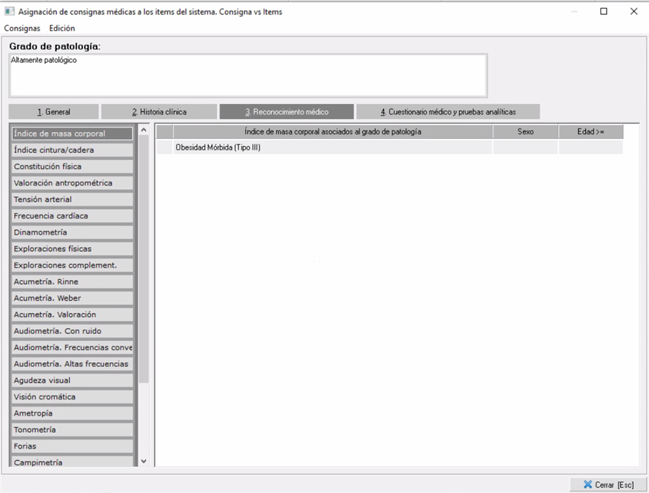 Por ejemplo, si va a la pestaña 3. Reconocimiento médico y pincha en 'Indice de masa corporal' puede comprobar que 'Obesidad mórbida' está catalogado como altamente patológico; además puede asignar más resultados a esta patología con el botón derecho 'Añadir nuevas relaciones' o editar la relación para definir para que sexo o edad esta valoración es patológica.