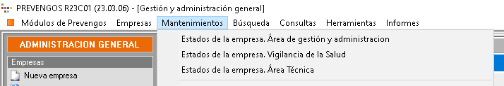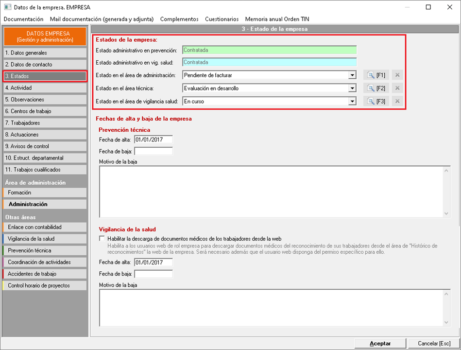 En la pestaña 3. Estado, de la ficha de datos de la empreas, puede asignar manualmente los campos Estado en el área de administración, Estado en el área técnica y Estado en el área de vigilancia salud, y la información de estos se muestra en los listados de empresas en los módulos GES/ADM, TEC y MED.