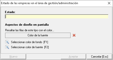 Al crear un estado podrá configurar un color para ese estado que será visible en el listado de empresas de todos los módulos donde se muestren columnas de 'Estado', de forma que es más visual para el usuario. Esto depende de la configuración general de Prevengos.