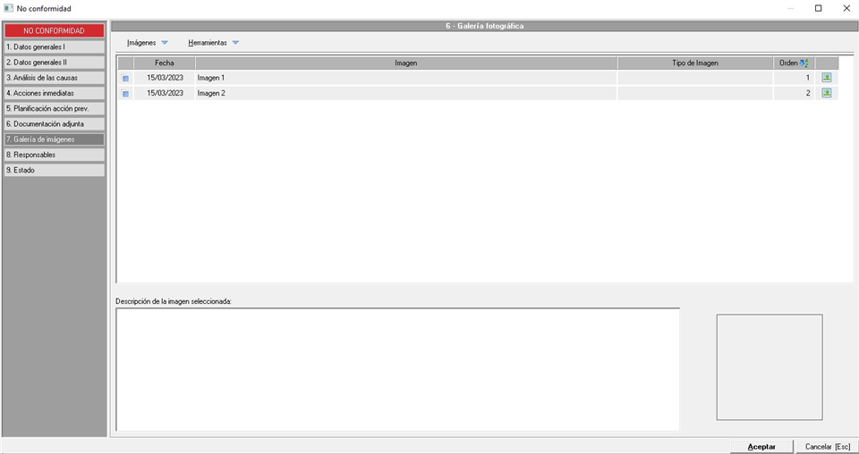 Dentro de este apartado el técnico podrá incluir las fotografías e imágenes relacionadas con la no conformidad que el técnico considere necesarias, puede utilizarlo, por ejemplo, para aportar fotos de evidencias de las deficiencias encontradas. La apariencia de esta pestaña es muy similar a la vista en el apartado anterior tal y como podemos ver en la siguiente imagen: