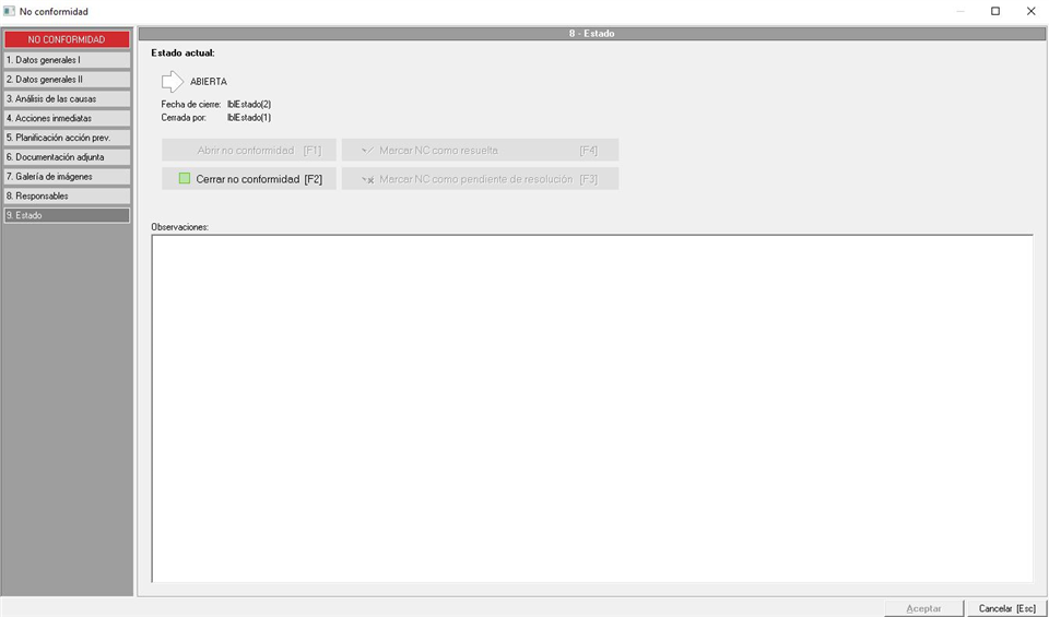 En esta última pestaña gestionaremos el estado de la no conformidad, en una ventana similar a la siguiente imagen: