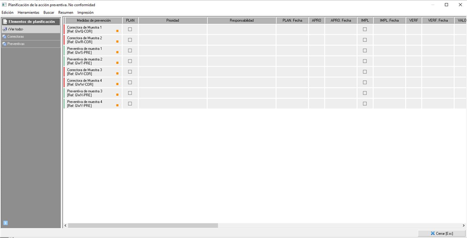Desde el menú Resumen tendremos acceso a una tabla informativa, donde se indicarán todos los elementos planificables (correctoras, preventivas, EPIs, señales, formación e información) y el estado/fase en el que se encuentran cada una de ellas