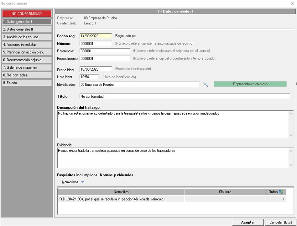 De este modo, se podrán registrar datos sobre una No conformidad detectada para indicar sus causas, acciones inmediatas e incluso poder planificar medidas. También se verá en este manual cómo indicar los requerimientos de las normativas sobre los que se detecta la No conformidad, adjuntar documentos e imágenes, asignar responsables, etc.