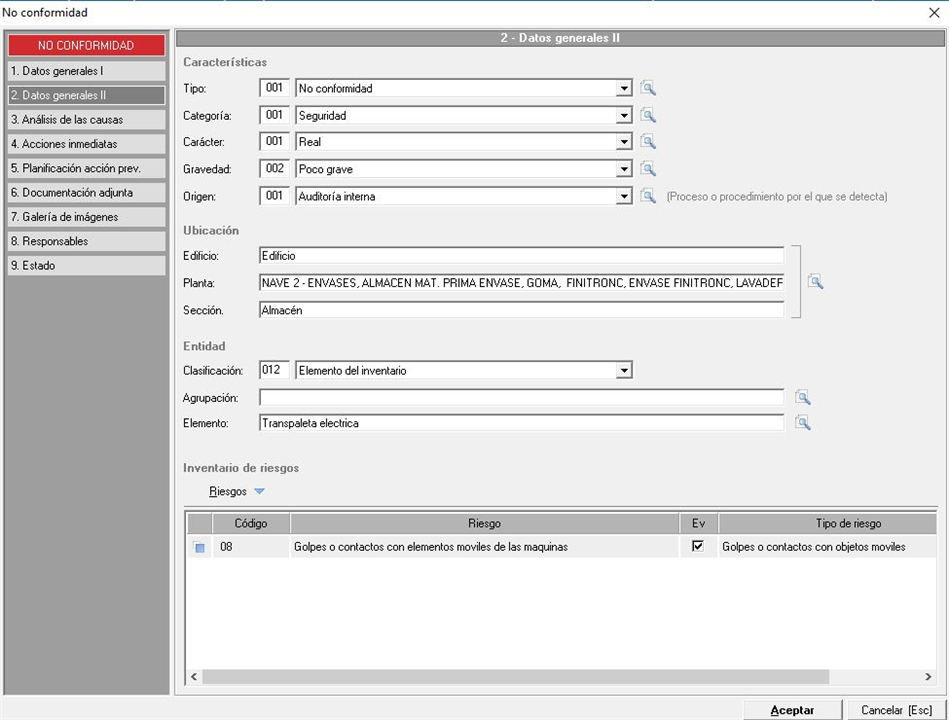 Dentro de esta pestaña podemos seguir indicando datos relativos a la no conformidad, sobre sus características, ubicación, entidad y riesgos. Para ello veremos una pantalla similar a la siguiente imagen: