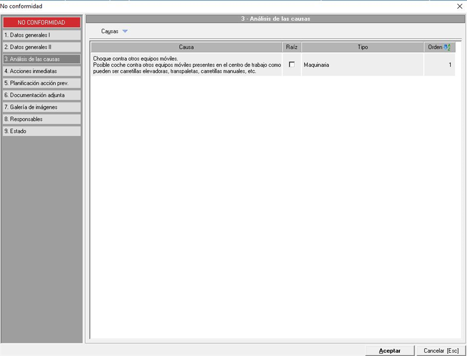 En esta pestaña el técnico puede añadir las causas de la no conformidad, en una ventana similar a la siguiente imagen: