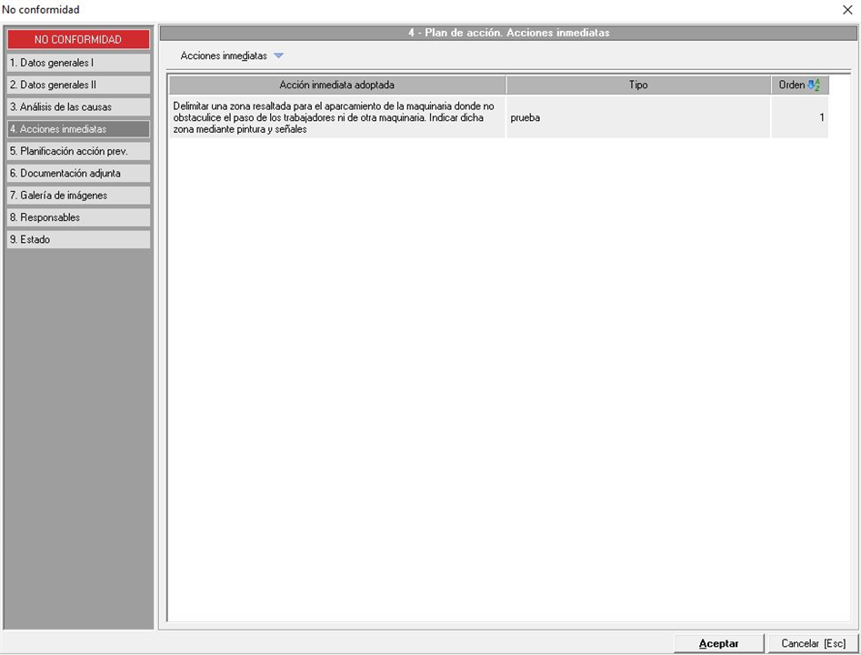 En esta pestaña el técnico puede añadir las acciones inmediatas de la no conformidad, en una ventana similar a la siguiente imagen: