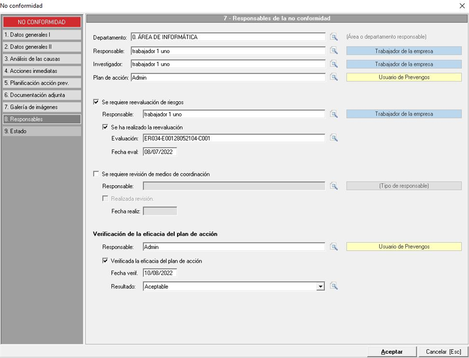 - Se requiere reevaluación de riesgos. En caso de que la no conformidad provoque la necesidad de volver a evaluar una evaluación de riesgos existente, lo indicaremos mediante este check. Posteriormente, debemos de indicar el responsable de realizar esta acción (de igual manera que en los puntos anteriores) e indicar la evaluación en cuestión y la fecha de la misma.