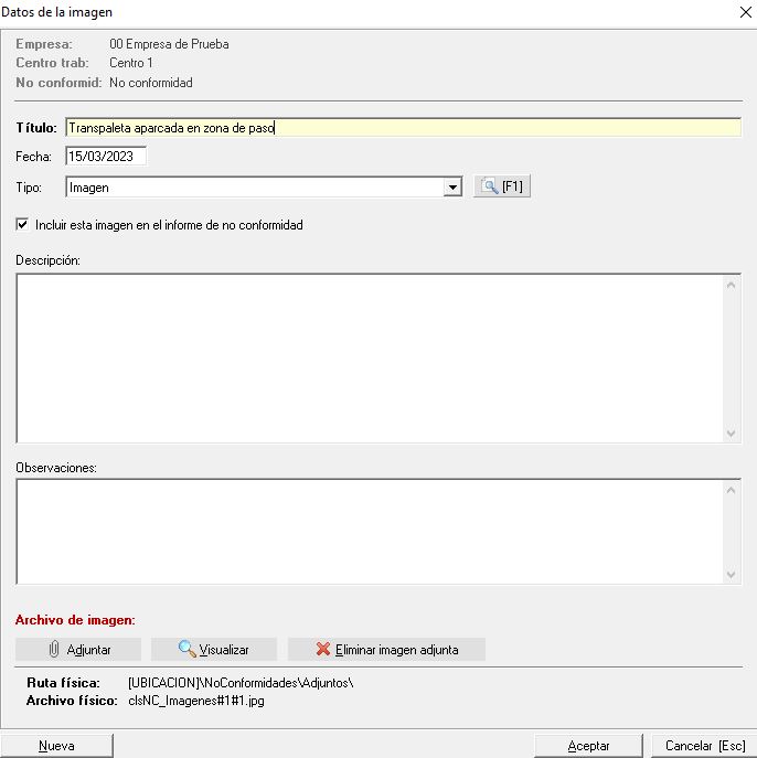 Como podemos apreciar en la imagen, el único campo obligatorio que tenemos que introducir es el Título que queremos establecer a la imagen que vamos a añadir, seguidamente la aplicación nos permite indicar la fecha, tipo (procedente de un mantenimiento) así como marcar el check para que la imagen se imprima en el documento de la no conformidad. Seguidamente indicaremos la descripción y observaciones de la misma. Por último, en la parte inferior y mediante el botón Adjuntar debemos seleccionar el fichero en nuestro ordenador para que Prevengos lo añada a su documentación.
