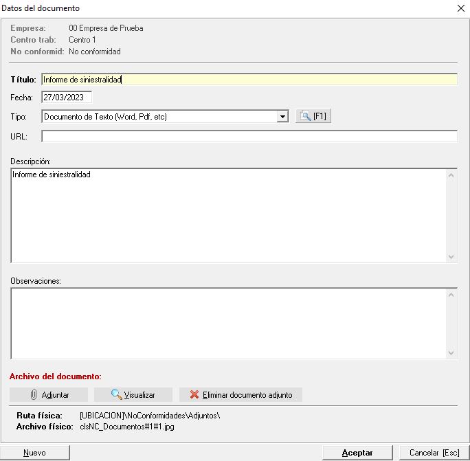 Dentro de esta ventana podemos especificar el Título que tendrá la imagen, una fecha asociada (por defecto Prevengos nos pone la actual), un tipo de documento (proveniente de su propio mantenimiento) así como la opción de añadir una URL (en caso de que el documento esté en una web o queramos indicar una web). Este último campo, en caso de indicar la URL de un documento no significa que se vaya a descargar y adjuntar el documento, simplemente estamos indicando en la No Conformidad que esa dirección web contiene un documento o información relevante.