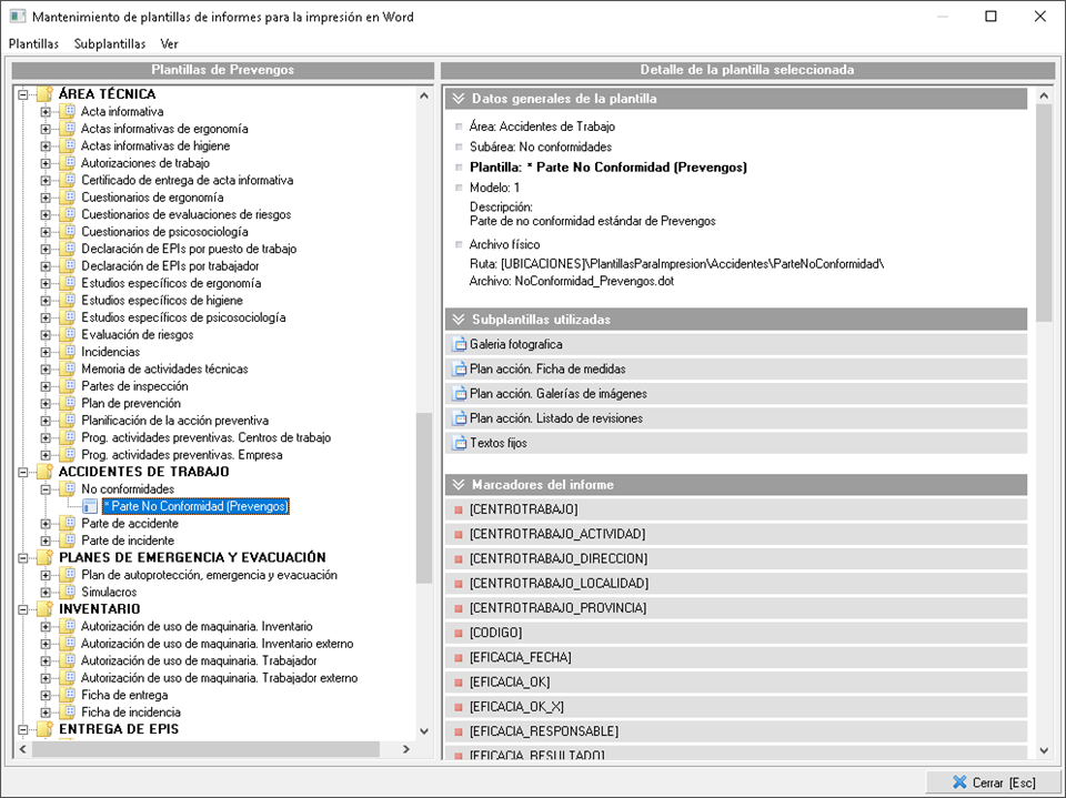 El documento se genera usando una plantilla de impresión que seleccionamos en el momento de generar el informe (si solo tenemos una plantilla la coge automáticamente). Estas plantillas las encontramos en el mantenimiento de plantillas, llamado "Plantillas de Impresión de Documentos de Word" situado en el menú superior "Documentos y cuestionarios" de la pantalla principal de Prevengos. La plantilla correspondiente a las incidencias la vemos resaltada en la siguiente imagen: