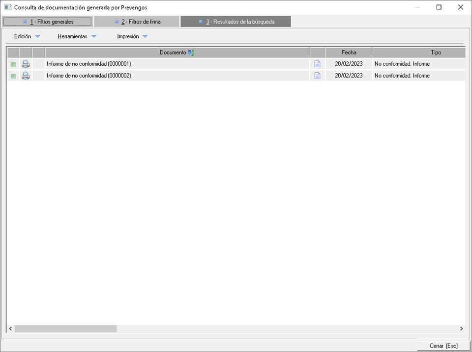 Devuelve un listado, mediante la consulta Consulta de documentos generados por Prevengos, con todos los documentos generados de no conformidad para los centros de la empresa.