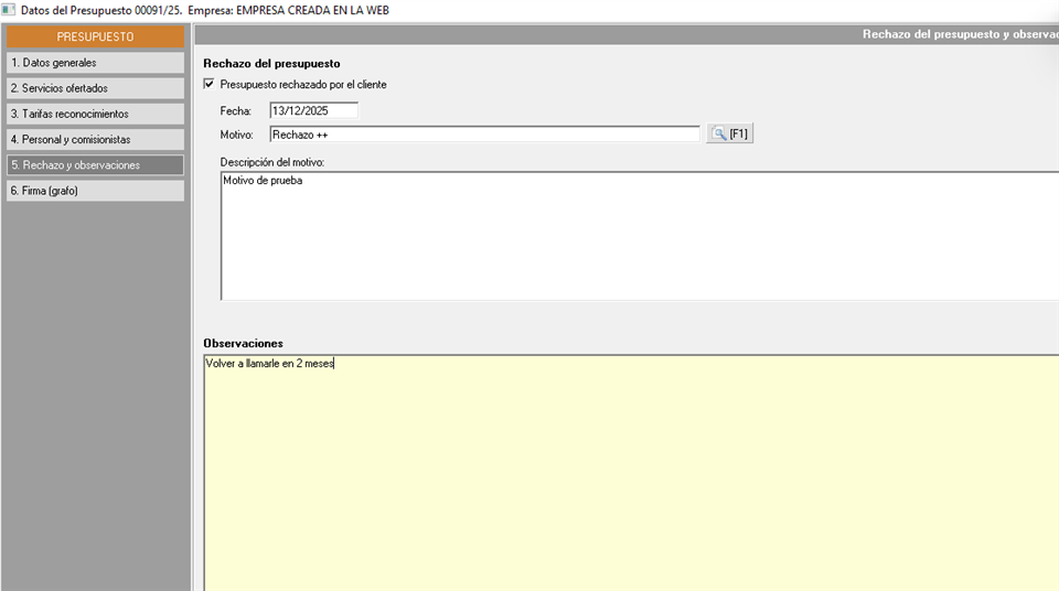 Además, podrémos marcar si el presupuesto ha sido rechazado por el cliente añadiendo la fecha y el motivo. Un presupuesto rechazado no se podrá contratar. Tambien podrémos tomar nota de observaciones libres que nos faciliten la aceptación del presupuesto en el futuro.