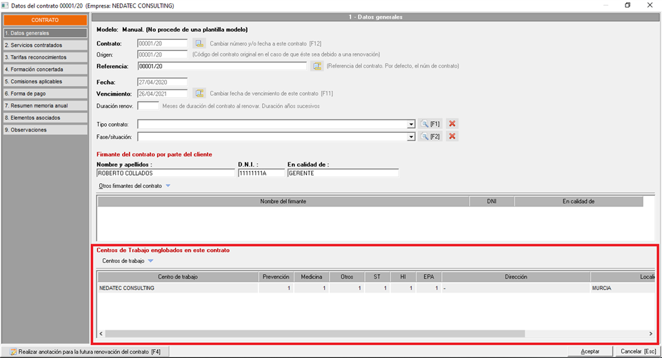 - Información de los servicios concertados. Funciona de forma similar a la opción anterior, pero además, se comprobará si la especialidad está concertada en los servicios incluidos en el contrato, y sólo se contabilizará el número de trabajadores si la especialidad está incluida en el contrato, por ejemplo, si en la información del centro de trabajo asociado al contrato han indicado que hay 8 trabajadores concertados en seguridad, pero la seguridad no es una especialidad incluida en los servicios del contrato, no se tendrán en cuenta esos 8 trabajadores.