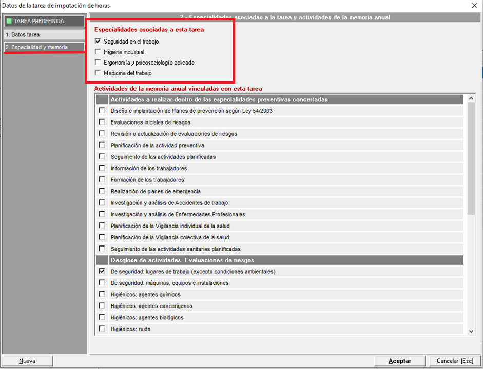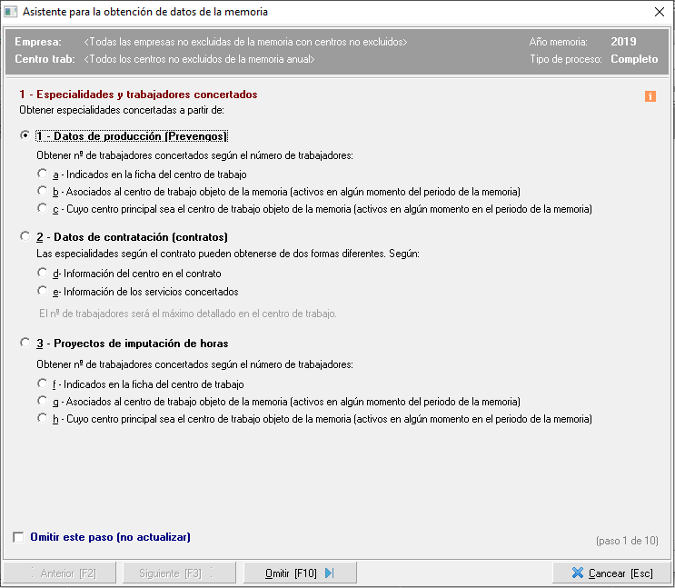 1. Datos de producción (Prevengos). Si seleccionan esta opción, el programa comprobará las actividades realizadas durante el año de la memoria en los distintos módulos de la aplicación, es decir, para determinar si se han contratado las distintas especialidades buscará si se han realizado actividades relacionadas a cada especialidad, de la siguiente forma:
