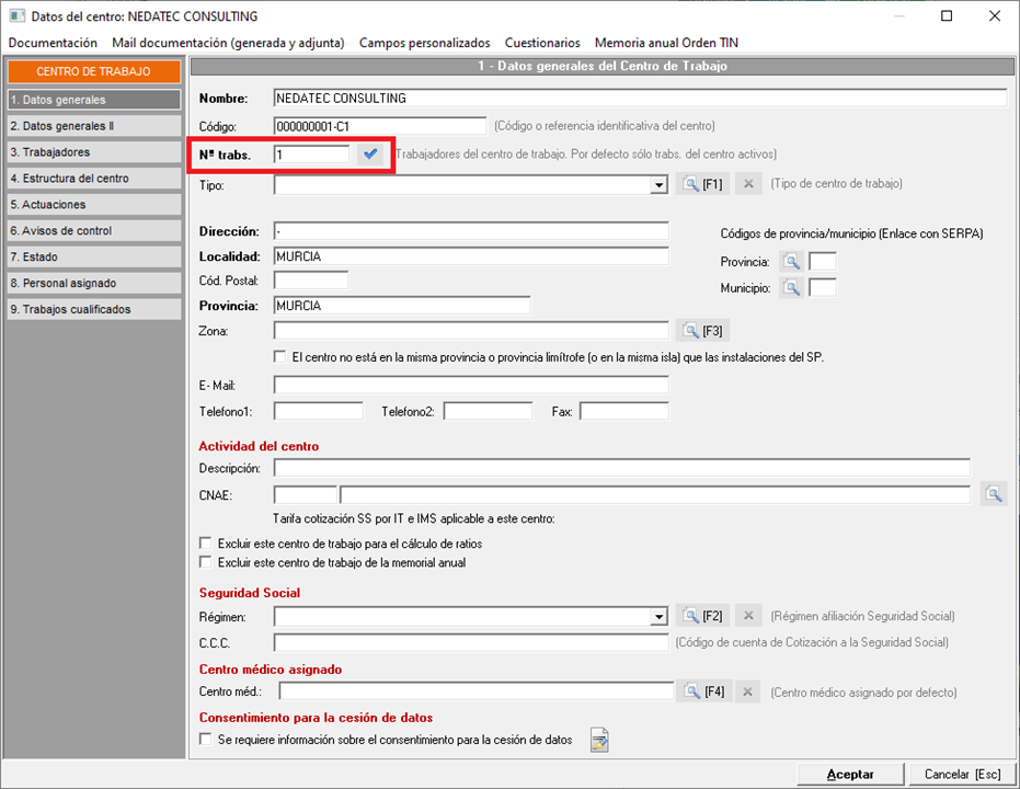 a. Nº de trabajadores indicados en la ficha del centro. Se obtendrá el número de trabajadores indicado la ficha de datos del centro, en concreto en la caja de texto que podemos encontrar en el apartado ‘Datos generales’ de la ficha del centro para el que se genera la memoria