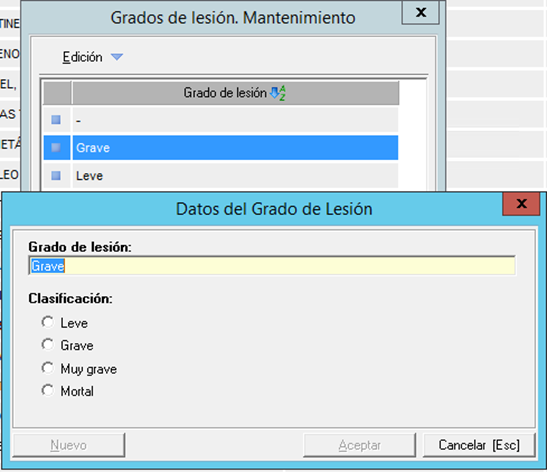 - En los casos de la siniestrabilidad y la investigación de accidentes (pasos 8 y 9), esta información se obtendrá de los accidentes registrados en la empresa, en los cuales la fecha del suceso o la fecha de investigación, respectivamente, deberá coincidir con el año para el que se genera la memoria. Además, para que los accidentes se tengan en cuenta en la memoria, necesitamos realizar una configuración muy sencilla en el mantenimiento de ‘grados de lesión’ de los accidentes, esta configuración requiere que en el mantenimiento indicado, marquen la clasificación correspondiente a cada grado de lesión existente en el mantenimiento, ya que la Orden TIN clasifica los accidentes según el grado de lesión en los cuatro tipos de clasificación que pueden ver en la imagen que se adjunta a continuación.
