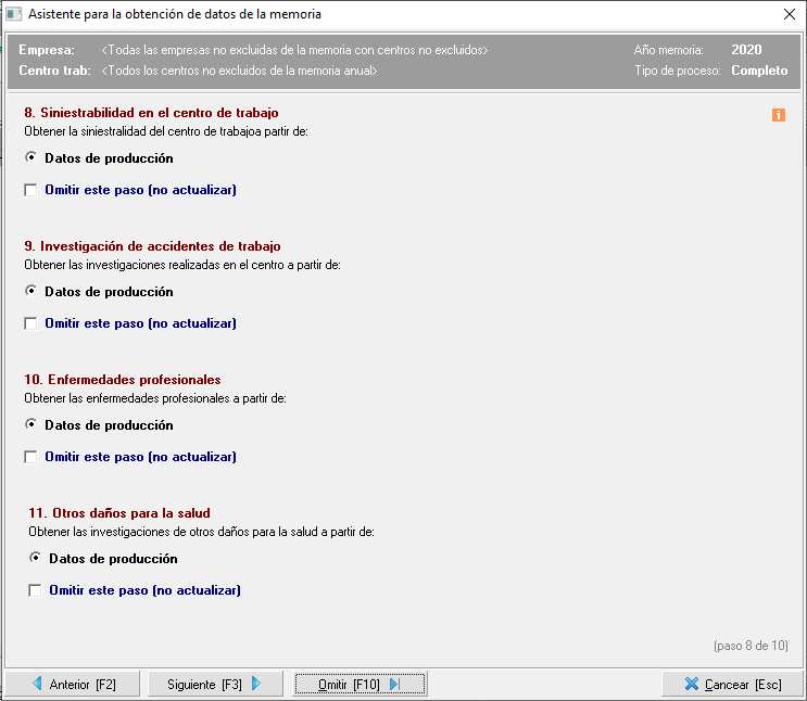 Cómo pueden observar en la imagen anterior, en este caso, en cada uno de los apartados incluidos en este paso sólo se les ofrece la opción de 'Datos de producción', esto se debe a que esta información sólo podrá obtenerse del módulo de accidentes de Prevengos. En el caso de las horas dedicadas, para esta información la Orden TIN no requiere el tiempo dedicado a esas actividades, por eso, tampoco hay opción para elegir de donde quieren obtener este dato.