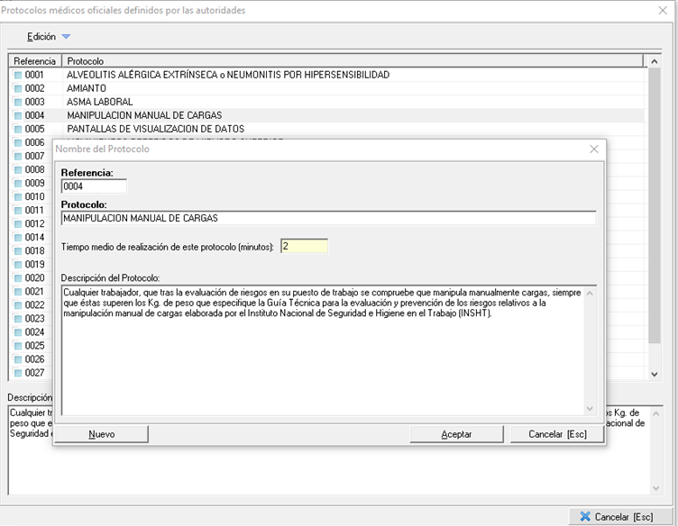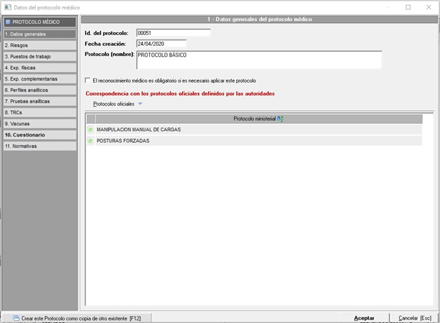 - Protocolos ‘oficiales’. Son los protocolos definidos por el Ministerio. Se asocian a los protocolos ‘internos’, de manera que cuando relacionamos un protocolo ‘interno’ a un reconocimiento, estamos indicando a su vez los protocolos ‘oficiales’ que se le están aplicando. Por ejemplo un protocolo ‘interno’ puede tener como nombre ‘Protocolo básico’, y tener asociados, los protocolos ‘oficiales’ de ‘Manipulación de cargas’ y ‘Posturas forzadas’.