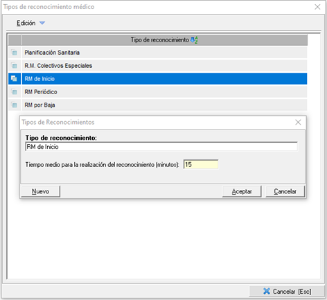 - Configuración de tiempos estimados por reconocimiento médico. Para realizar esta configuración deben dirigirse al mantenimiento de "tipos de reconocimientos". (menú Mantenimientos > Tipos de... > Reconocimientos médicos, módulo MED )