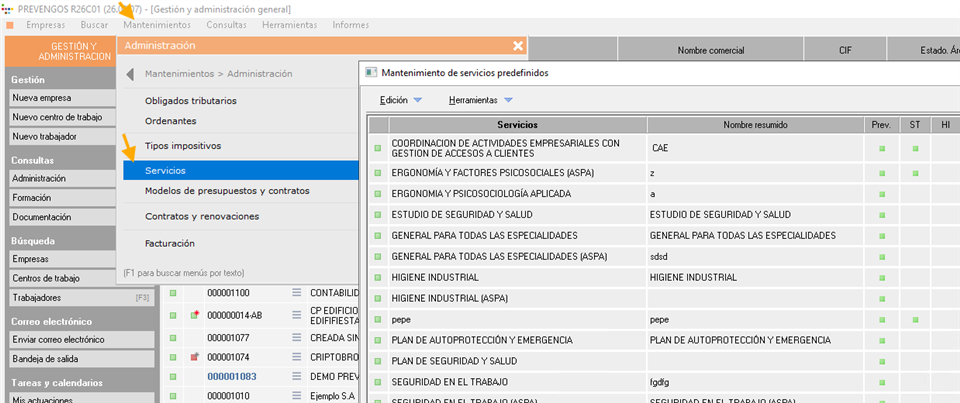 Para configurar los servicios que posteriormente incluirán en los contratos, se van a dirigir a la pantalla de configuración correspondiente, por lo que se van a situar en el módulo de ‘Gestión y Administración’, van a desplegar el menú Mantenimientos > Administración > Servicios.