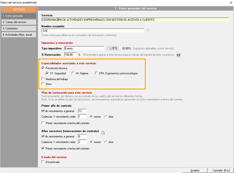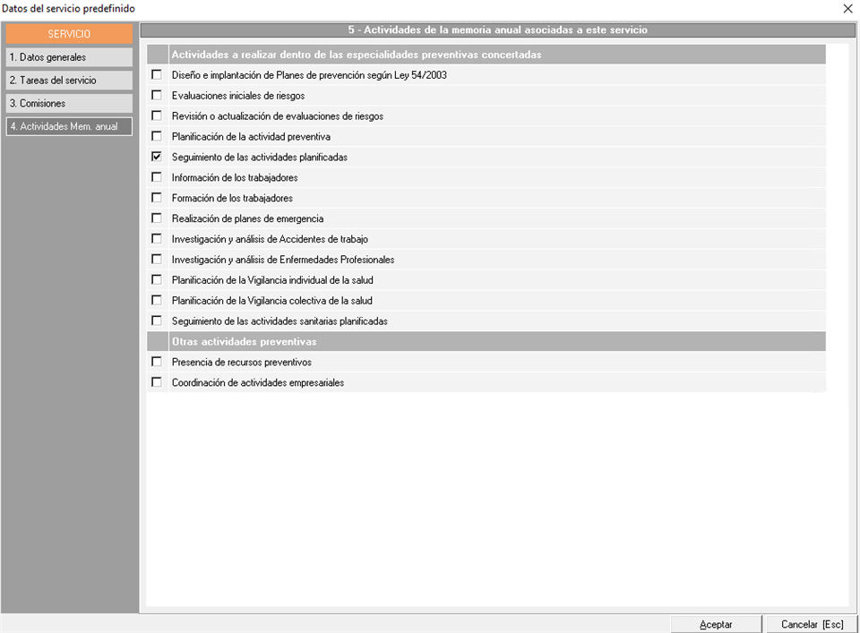 2. Actividades concertadas. Además de las especialidades concertadas, podrán indicar también las actividades que se contratan cuando ese servicio se incluye en un contrato. Esta configuración la llevarán a cabo también en la ficha del servicio, pero en el apartado ‘3. Actividades Mem. Anual’, en el que marcarán las actividades relacionadas a ese servicio.