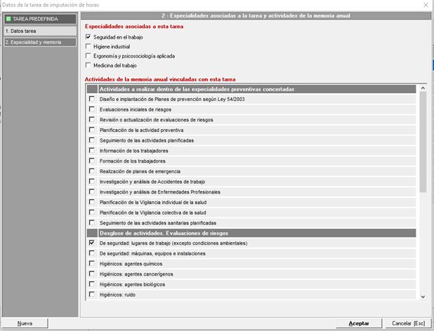 1. Especialidades asociadas a esta tarea. Donde indicarán las especialidades correspondientes a la misma. Esta información le servira a Prevengos para obtener las especialidades concertadas por el cliente y también para sumar las horas por especialidad en el resumen final de la memoria, siempre que el usuario seleccione que esta información la quiere obtener de la imputación de tiempos en el módulo de horas.