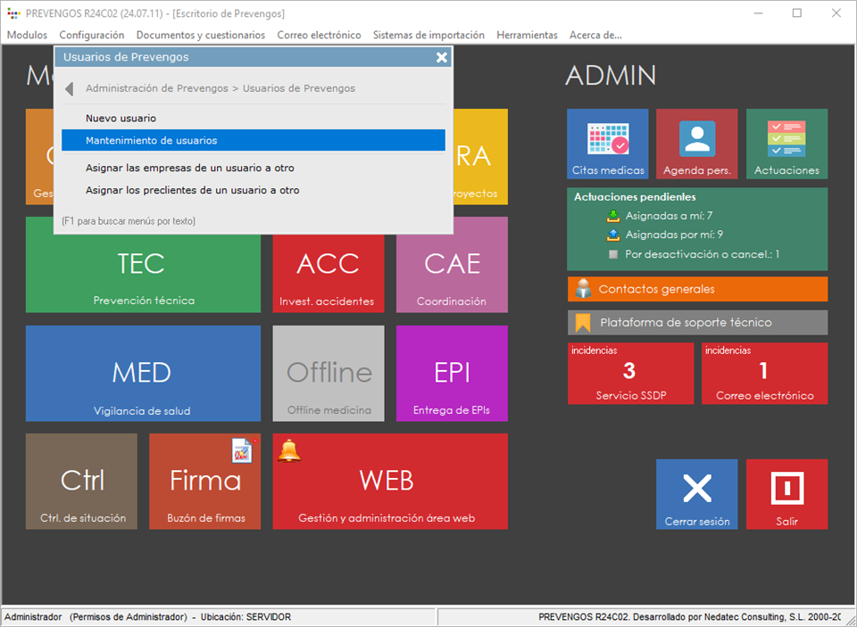 Una vez dentro de Prevengos, deben situarse en la pantalla principal de la aplicación, usar el menú Configuración > Usuarios de Prevengos > Mantenimiento de usuarios.