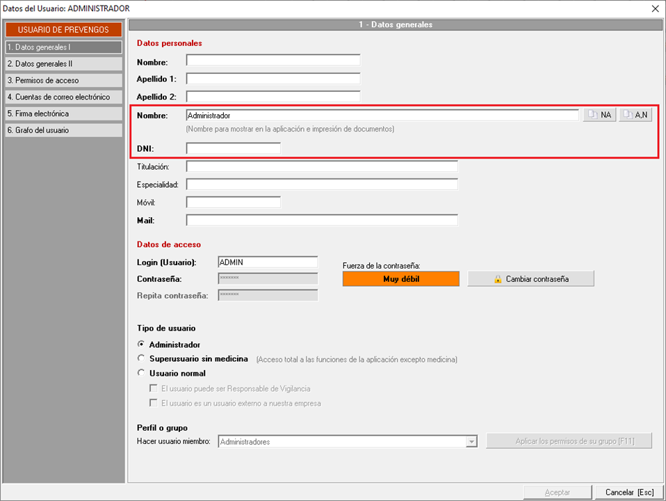 Esta configuración sólo pueden llevarla a cabo usuarios de Prevengos que tengan un perfil de ‘Administrador’, por lo que deben iniciar Prevengos con un usuario que tenga este perfil.