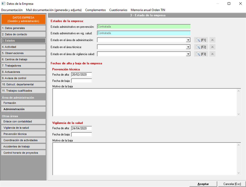 - Estar o haber estado de alta en el año de la memoria. Esta comprobación se realiza mediante las fechas de alta y baja/desactivación, que podemos encontrar en el apartado ‘3. Estados’ de la ficha de datos del cliente, y de las fechas de alta y baja de los centros de trabajo, también en el apartado ‘Estado’ pero en este caso de la ficha de datos del centro.