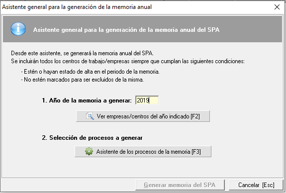 Como pueden observar en la primera imagen de la página, el botón ‘Generar memoria del SPA’ está deshabilitado, para activarlo, deben acceder primero al asistente e indicar las opciones de generación de la memoria. A continuación accederán a este asistente e iremos desgranando paso por paso, las opciones que tienen y de donde saca el programa la información en función de la opción seleccionada en cada caso, por lo tanto, pulsen en el botón ‘Asistente de los procesos de la memoria’.