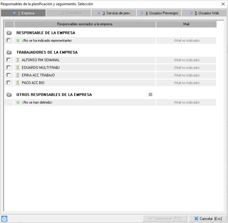 El campo de Responsables Al añadir responsables se nos abrirá una ventana como la de la imagen de abajo, aquí podremos seleccionar cualquier persona física de la empresa incluida en Prevengos o un cargo general concreto desde las pestañas superiores en las que encontramos, Empresa, Servicio de prevención, Usuarios Prevengos y Usuarios Web.