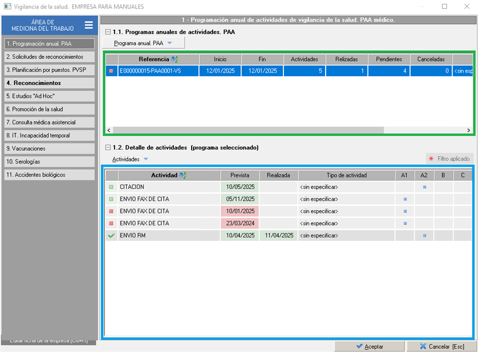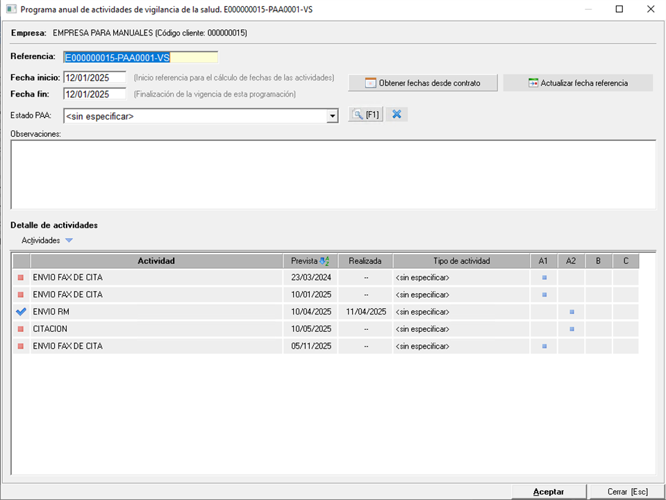 El programa anual de actividades (PAA) es la primera herramienta que encontramos dentro del área de Vigilancia de una empresa. Nos permite planificar y gestionar las actividades relacionadas con medicina que se van a desarrollar dentro de un periodo de tiempo predefinido. Este programa nos genera una memoria anual de actividades para la empresa y además nos planifica sus actividades en la agenda de los responsables de la actividad en cuestión.