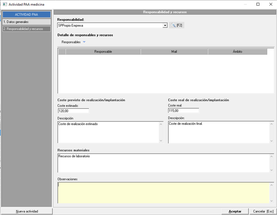 Si traemos la actividad desde el mantenimiento, apreciamos que la mayoría de los datos son importados desde ahí, no obstante pueden ser modificado para este PAA donde se han insertado.