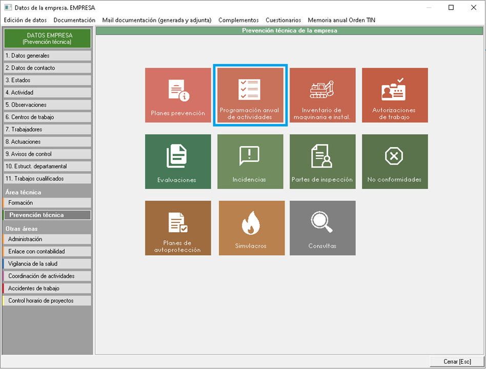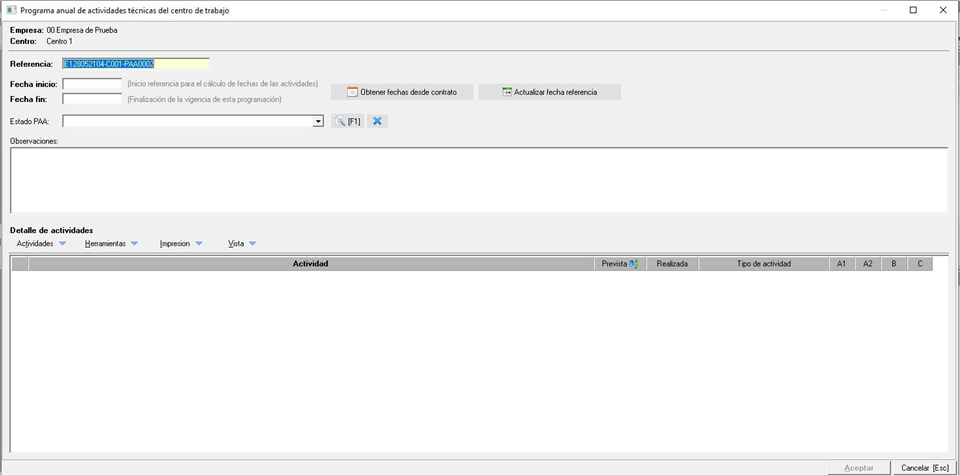 Desde esta herramienta podrán crear programas anuales de actividades relacionadas con el área técnica, tanto a nivel de empresa como de centro de trabajo, tal y como explicaremos en este manual.