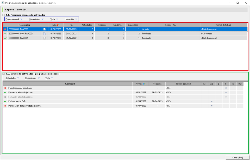 El programa anual de actividades (PAA) es una herramienta que encontramos dentro del área Técnica de una empresa. Nos permite planificar y gestionar las actividades relacionadas con la prevención técnica que se van a desarrollar dentro de un periodo de tiempo predefinido. Este programa nos genera una memoria anual de actividades para la empresa y además nos planifica sus actividades en la agenda de los responsables de la actividad en cuestión.