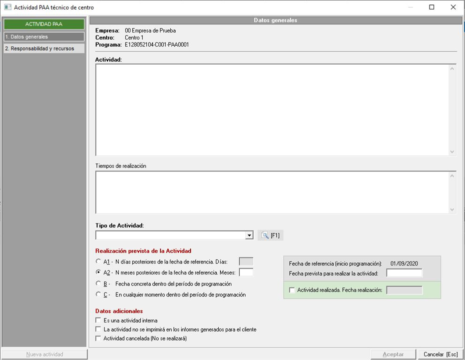 - A1/A2: Indicaremos la cantidad de días o meses que se le van a sumar a la fecha de inicio del PAA para calcular la fecha prevista de realización.