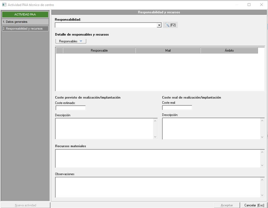 Pasamos ahora a la segunda pestaña referente a los responsables y recursos, en la cual veremos una pantalla similar a la siguiente captura: