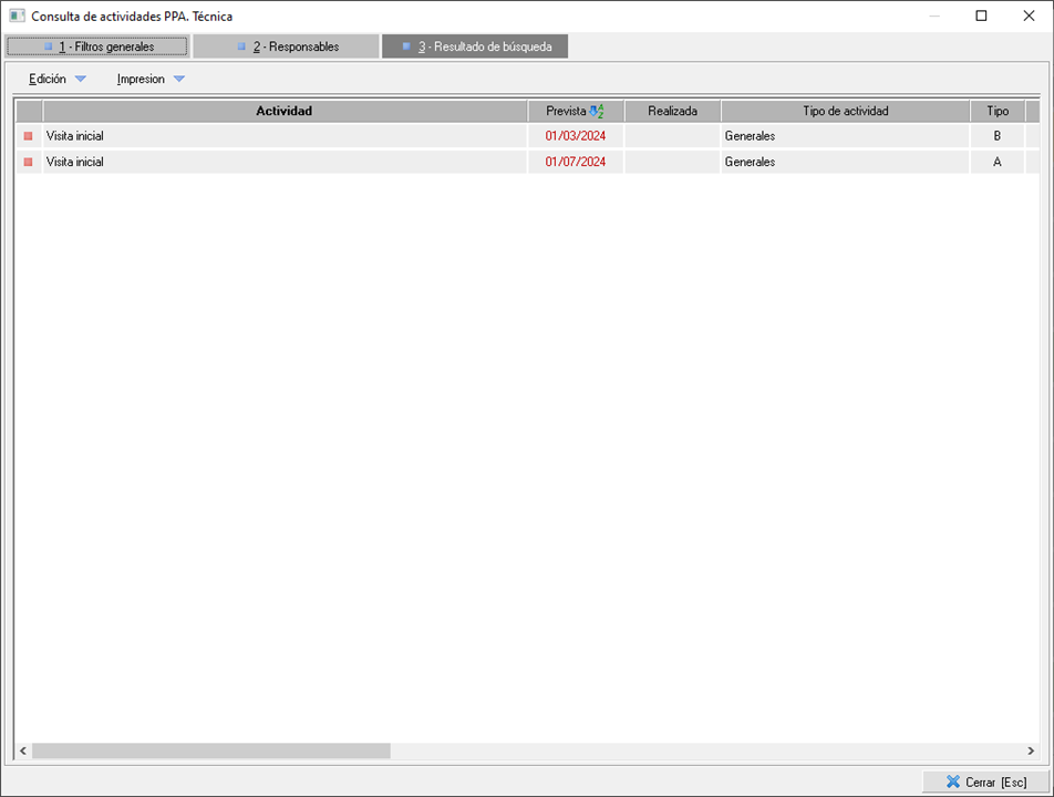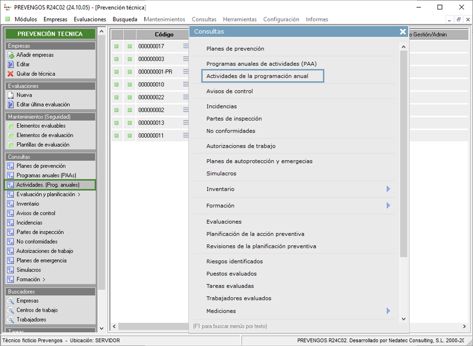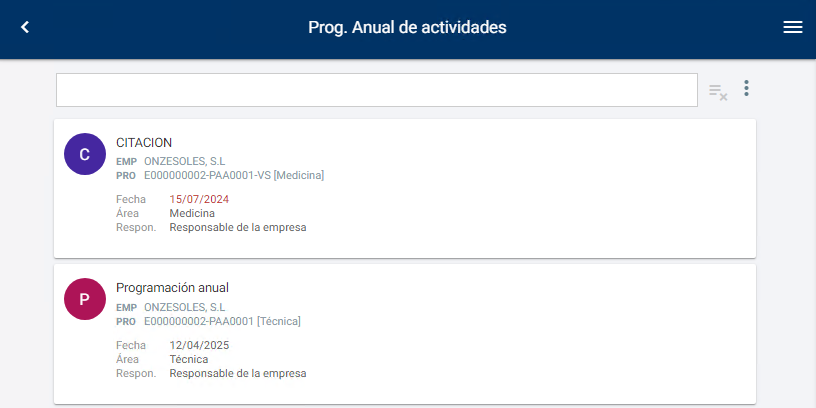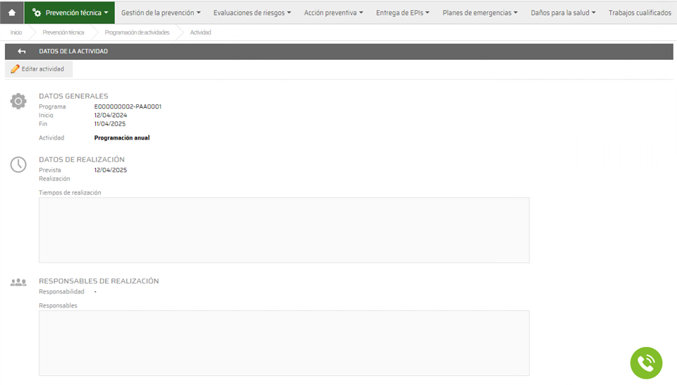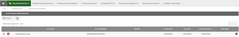 Situado en el área de prevención, tiene que usar el menú Gestión de la prevención > Programación de actividades para acceder al listado de actividades en las que está asignado como responsable.
